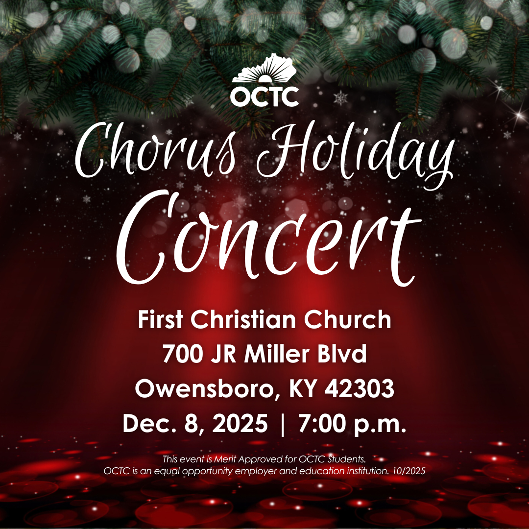 Owensboro, KY (12/01/2025) — Owensboro Community and Technical College Chorus (OCTC), under the direction of Dr. Connie Ford, Professor of Music, and accompanied by pianist Anna Sparks, will perform a Christmas concert at First Christian Church on Monday, Dec. 8 at 7:00 p.m. (700 JR Miller, Owensboro KY). Featured composers of the 17th, 20th and 21st century programmed works, which cover a wide variety of styles, include Mitchell Covington, Dan Forrest, Elaine Hagenberg, Mark Hayes, Howard Helvey, Giovanni Nanino, Mitchell Southall, Will Todd, and Jonathan Willcocks. Guest artists include pianist Angela Bruce and oboist Meggan Clark. The fifty-member OCTC Chorus has presented fall and spring concerts since spring 1987.