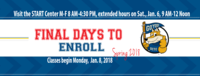 Extended office hours for registration include this Saturday, January 6, from 9 a.m.-noon. The START Center, the Financial Aid Office, Counseling Center, Student Records, and the Bookstore will all be open on Saturday for these extended hours, all offices are located in the Campus Center on the Main Campus at 4800 New Hartford Road.