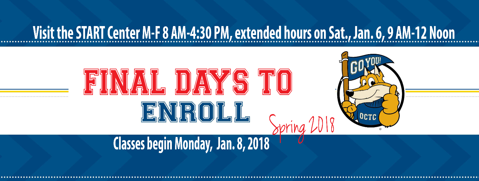 Owensboro, KY (01/02/2018) — It is not too late to sign up for the spring semester at Owensboro Community and Technical College (OCTC). Visit our website at Owensboro.kctcs.edu and then select "Apply Now," or visit the START Center, located in the upper level of the Campus Center on the Main Campus. START Center office hours are Monday-Thursday 8 a.m.-5:30 p.m. and Friday 8 a.m. 4:30 p.m. Classes begin January 8, 2018.