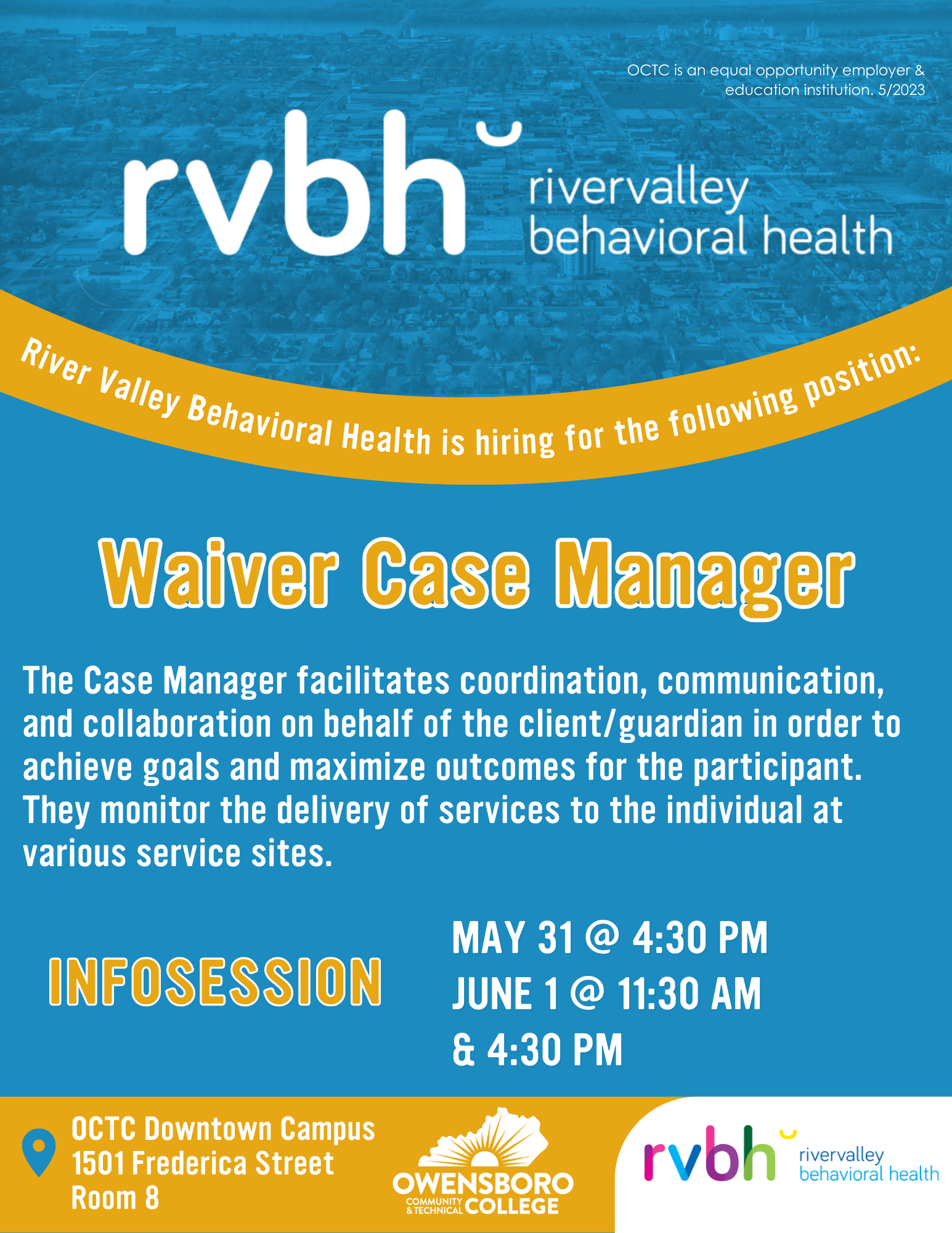 Owensboro, KY (05/30/2023) — River Valley Behavioral Health and Owensboro Community and Technical College (OCTC) are partnering to host info sessions for the open position of Waiver Case manager at River Valley. OCTC Workforce Solutions is excited to partner with River Valley Behavioral Health to provide a work-and-learn model geared toward leadership and team-building skills. The program is designed for those who are currently in leadership roles or those who will transition to leadership roles in the future. River Valley is actively working to ensure new recruits are ready for their roles with clients as well as ready to serve as community leaders