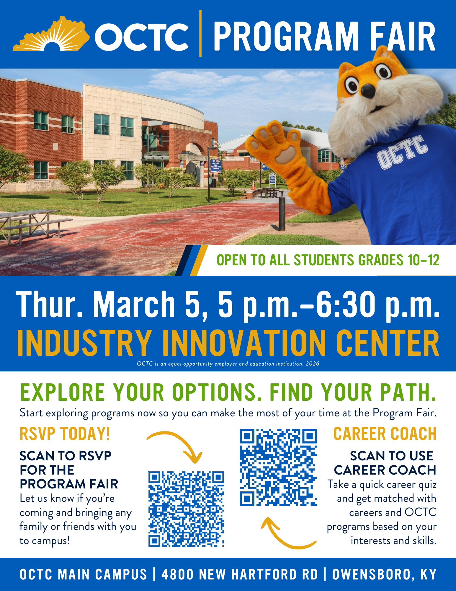 Owensboro, KY (02/24/2026) — Owensboro Community & Technical College (OCTC) will host its upcoming Program Fair, an event designed specifically for high school students in grades 10-12 who are beginning to explore college and career options. The fair will take place on OCTC's Main Campus at 4800 New Hartford Road in Owensboro, KY (42303) in the Industry Innovation Center on Thursday, March 5, 2026 from 5 p.m. to 6:30 p.m.