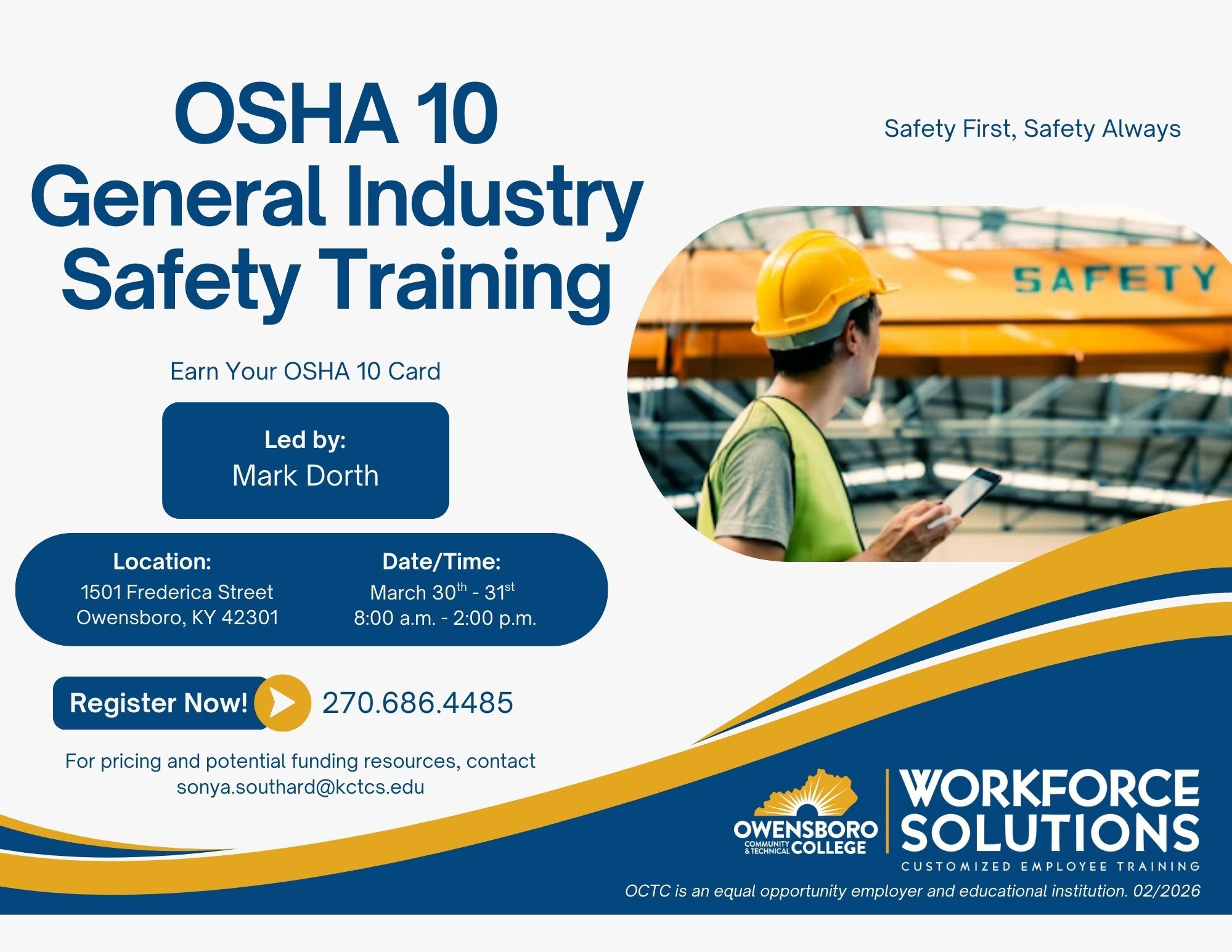 Owensboro, KY (03/16/2026) — Owensboro Community & Technical College's (OCTC) Workforce Solutions division will host two upcoming OSHA 10 safety training courses designed to help workers earn their OSHA 10 certification card and strengthen workplace safety awareness.