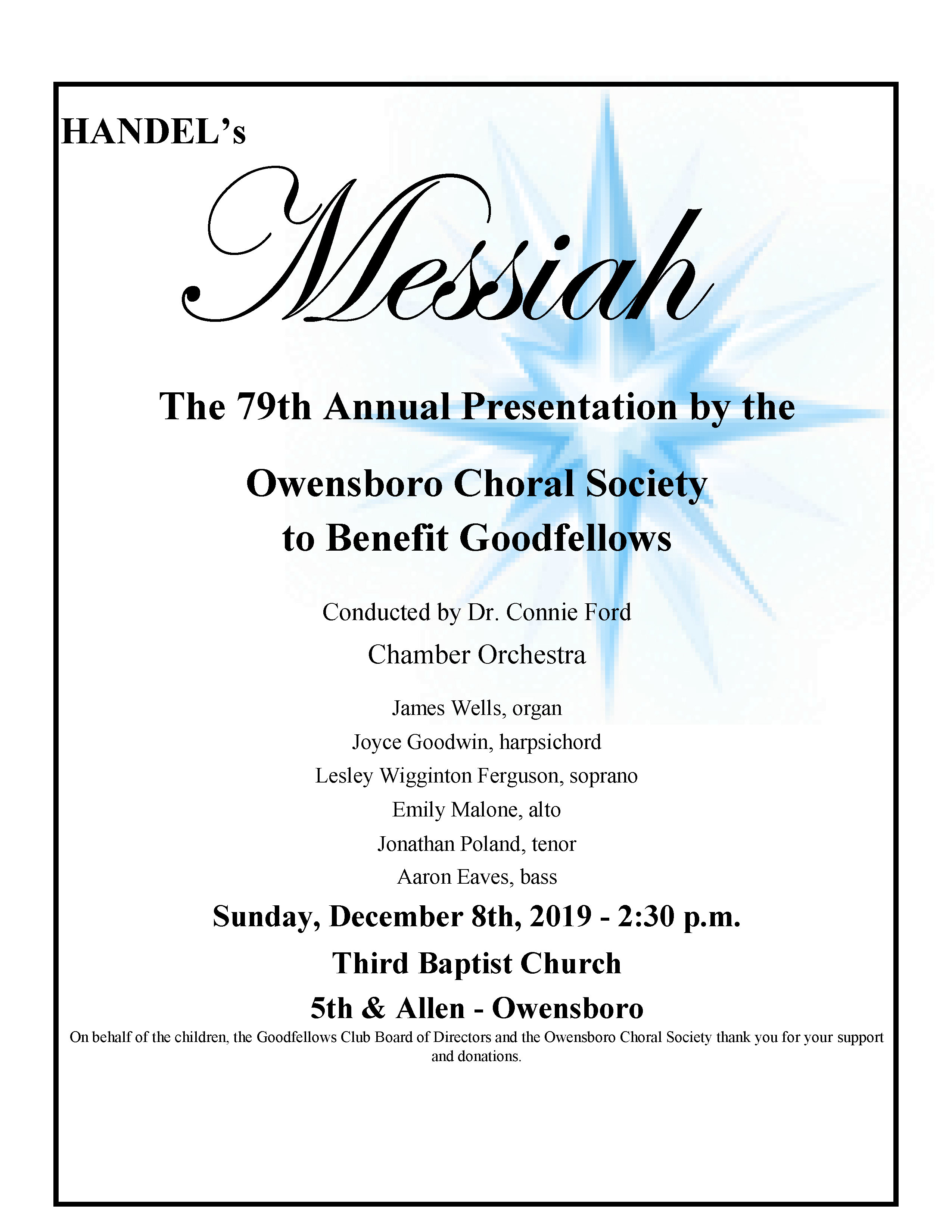 The Messiah performance has maintained a long relationship with the Goodfellows of Owensboro and a free-will offering will be taken during the performance for their work in the community. Donations, also, to the Owensboro Choral Society will help ensure the continued performance of Handel's Messiah in the Owensboro community.